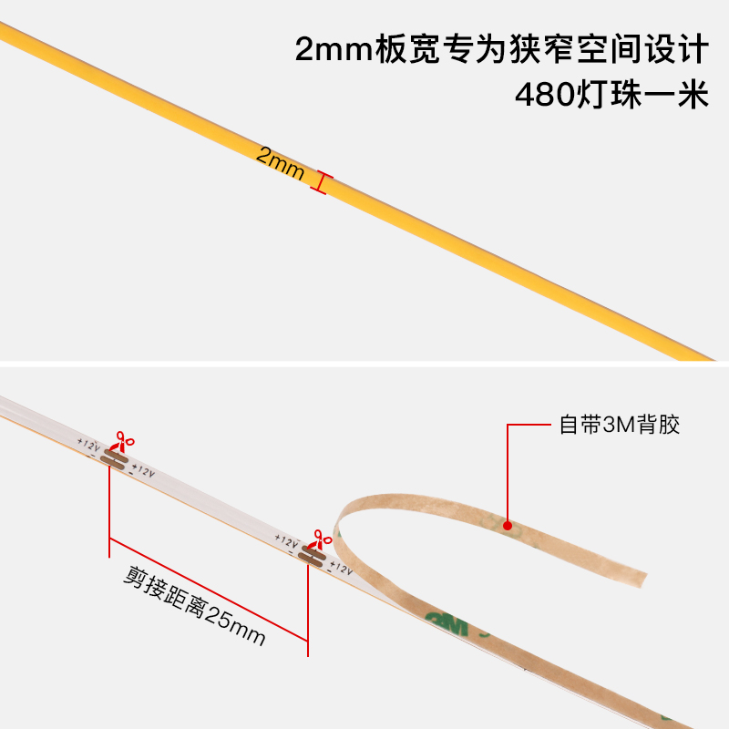 超窄板宽2mm灯带led条 自粘无频闪超亮高显指低压氛围装饰cob灯带
