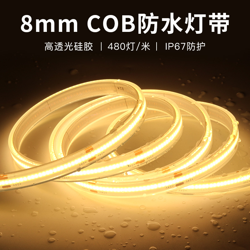 8mm COB IP67防水灯带 实心硅胶一体平面挤出 户外低压24V防水led灯条
