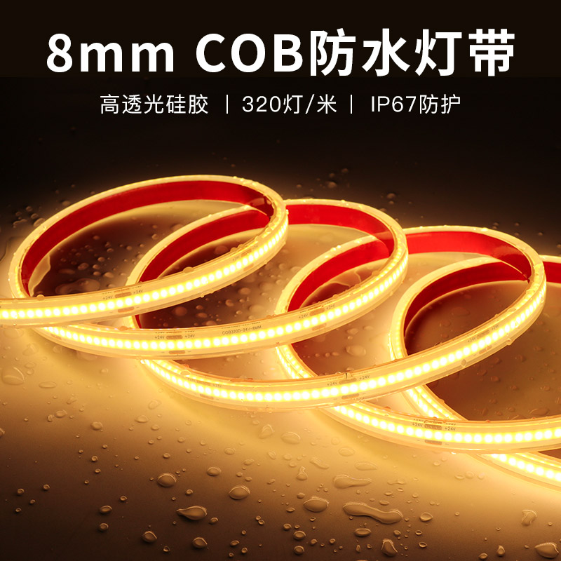 8mm宽cob防水灯带 IP67防护实心硅胶一体挤出 单色高亮户外led条